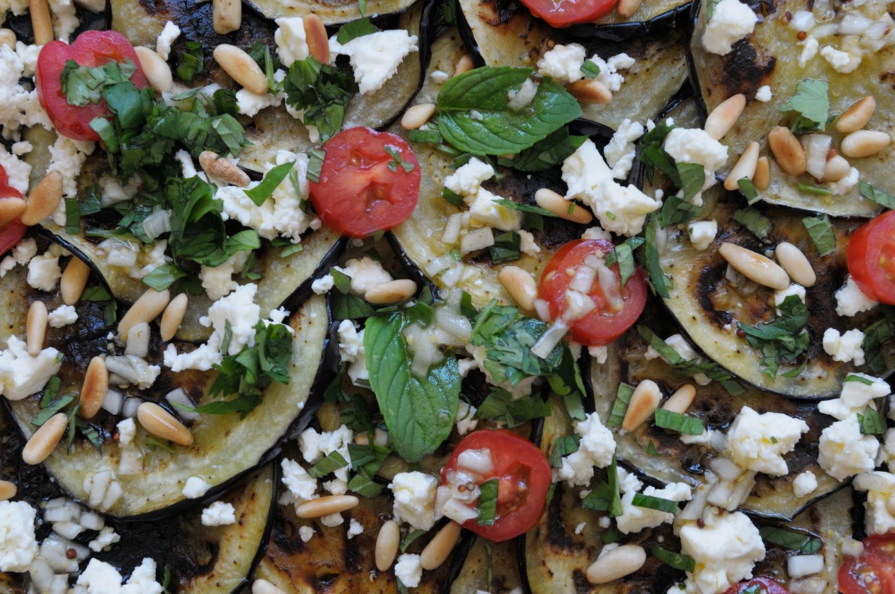 Pasar las berenjenas a la plancha en una sartén pintada con aceite de oliva.