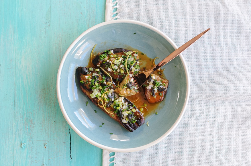 De todas mis recetas preferidas para llevar berenjenas a la mesa con regularidad, quizá ésta es la que disfruta de un mejor equilibrio entre potencia de sabor y ligereza.