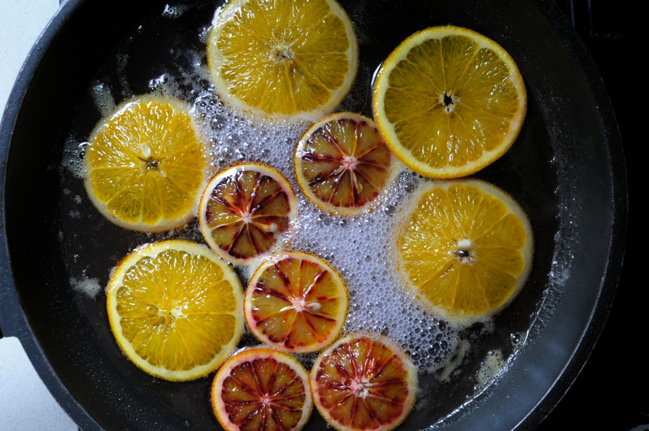 Como es lo que más tiempo lleva, empezamos por las naranjas confitadas. Esto si queremos nos lo podemos dejar hecho el día anterior, o cuando queramos, porque se pueden guardar en un bote con su almíbar y también congelar de una en una entre dos capas de papel sulfurizado.