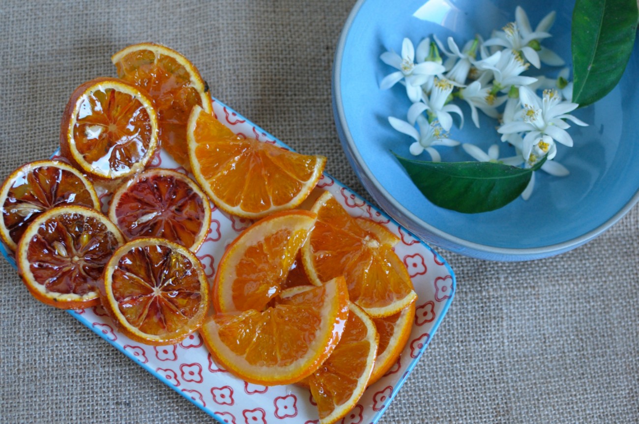 Cortamos la naranja en láminas muy muy finas. Hay quien las blanquea en agua con sal un par de minutos para quitar el amargor de la corteza, yo no tengo costumbre. La cosa no puede ser más simple: ponemos a hervir el agua con el azúcar, removiendo hasta que se disuelva. Entonces dejamos caer las rodajitas de naranja, y las mantenemos a fuego muy suave entre una hora y hora y media. Desde ese momento ya no tocamos nada. El almíbar no debe solidificarse. Cuando apagamos el fuego debe seguir líquido, con textura de una miel ligera. Ayudándonos de una cucharita, sin mover las naranjas para que no pierdan su forma, podemos ir cogiendo almíbar y rociándolas por encima, para que se bañen por igual por los dos lados (como hacemos con el pollo y sus jugos en el horno) mientras se confitan.