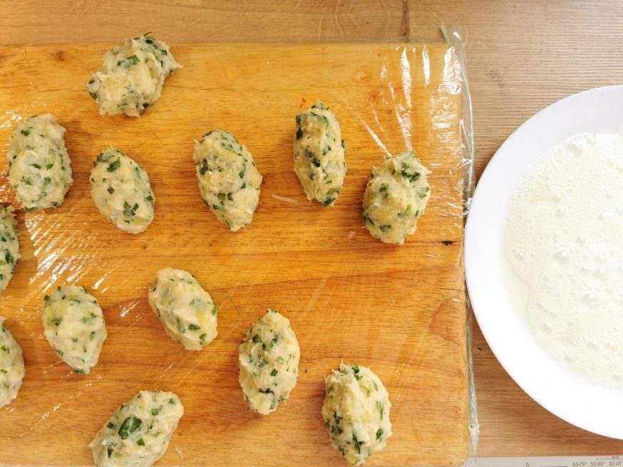 Cuando estemos listas para formar los buñuelos, nos humedecemos las manos y vamos formando piezas como para croquetas, pero ovaladas por los lados.