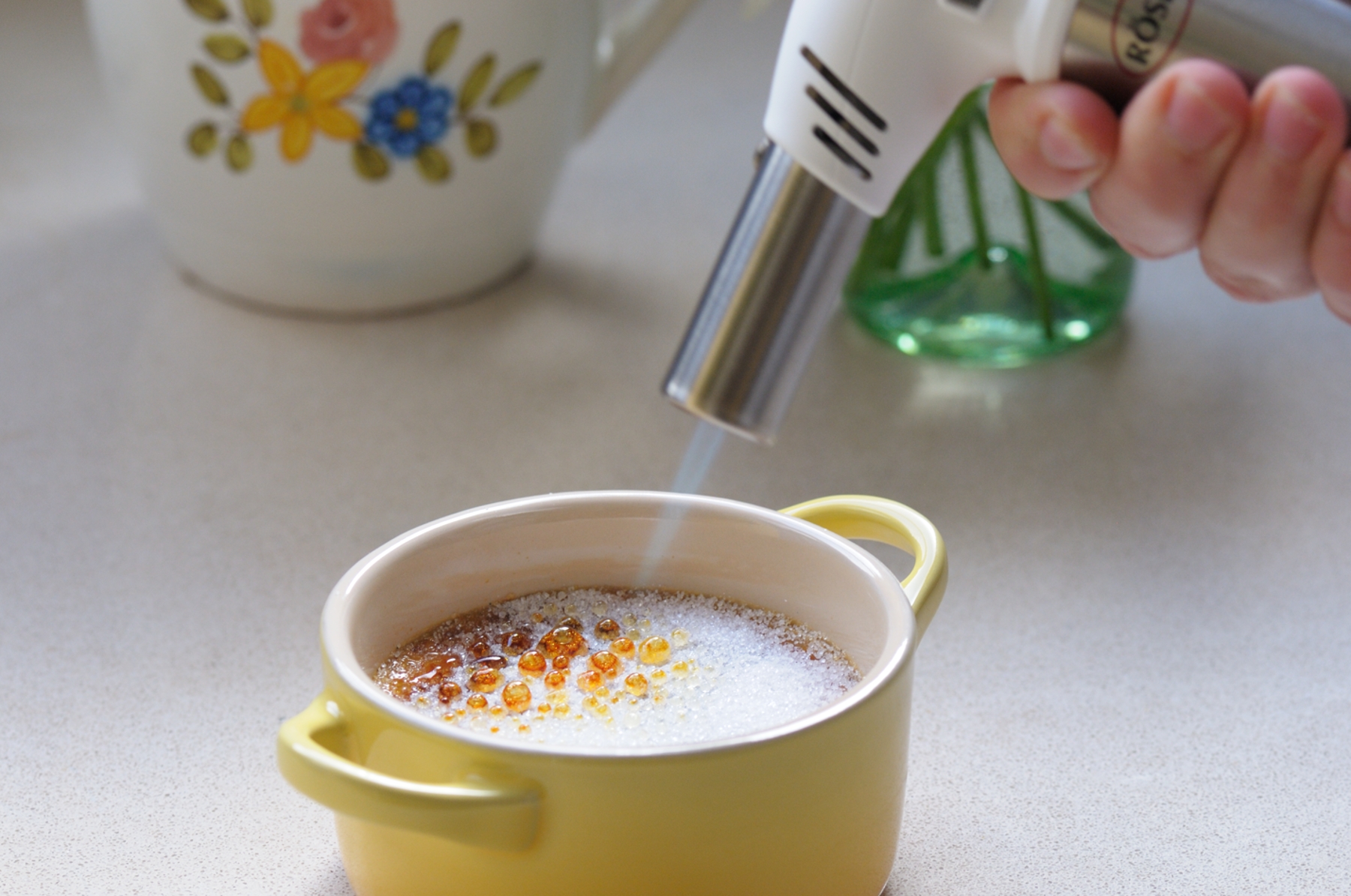 Espolvoreamos cada moldecito con dos cucharadas de azúcar, y lo quemamos con un soplete de cocina, sin acercarnos mucho y moviendo el soplete en círculos, para no quemar el azúcar demasiado pronto y que se vaya caramelizando por igual.