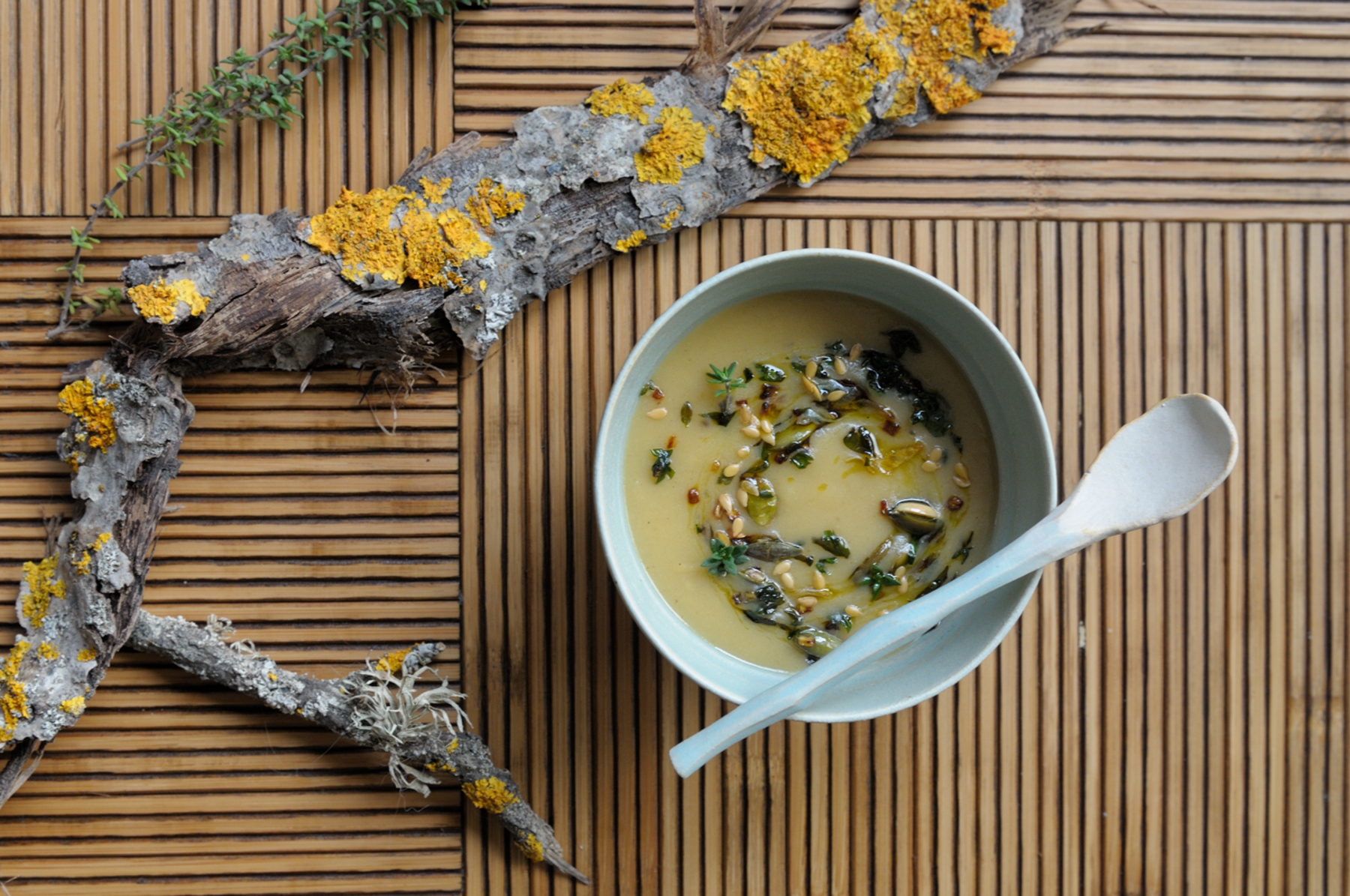 Lo servimos y lo rociamos con las semillas y las hojas sofritas. Y si queremos, con un hilito de aceite de oliva un poco especial.