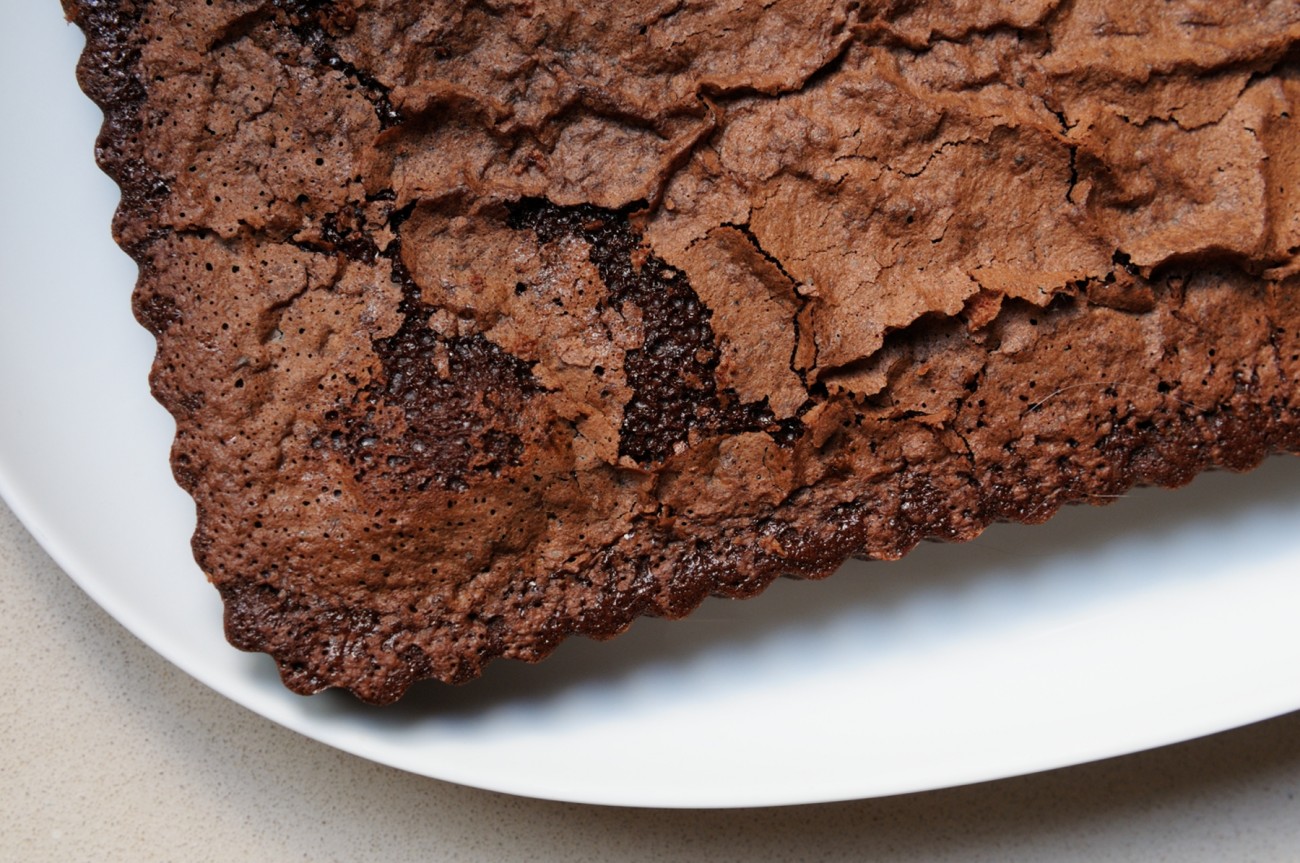 Pasar la mezcla al molde y cocer en el horno ya caliente, durante 30-35 minutos. La mezcla ya cocida se habrá fruncido ligeramente en los bordes del molde y retirado un pelín hacia el centro, y se habrá hinchado suavemente por el centro (luego puede bajar y la capa más superficial puede descender un poquito arrugada, como una piel finita). Un palillo insertado saldrá casi limpio, sólo con restos de humedad.