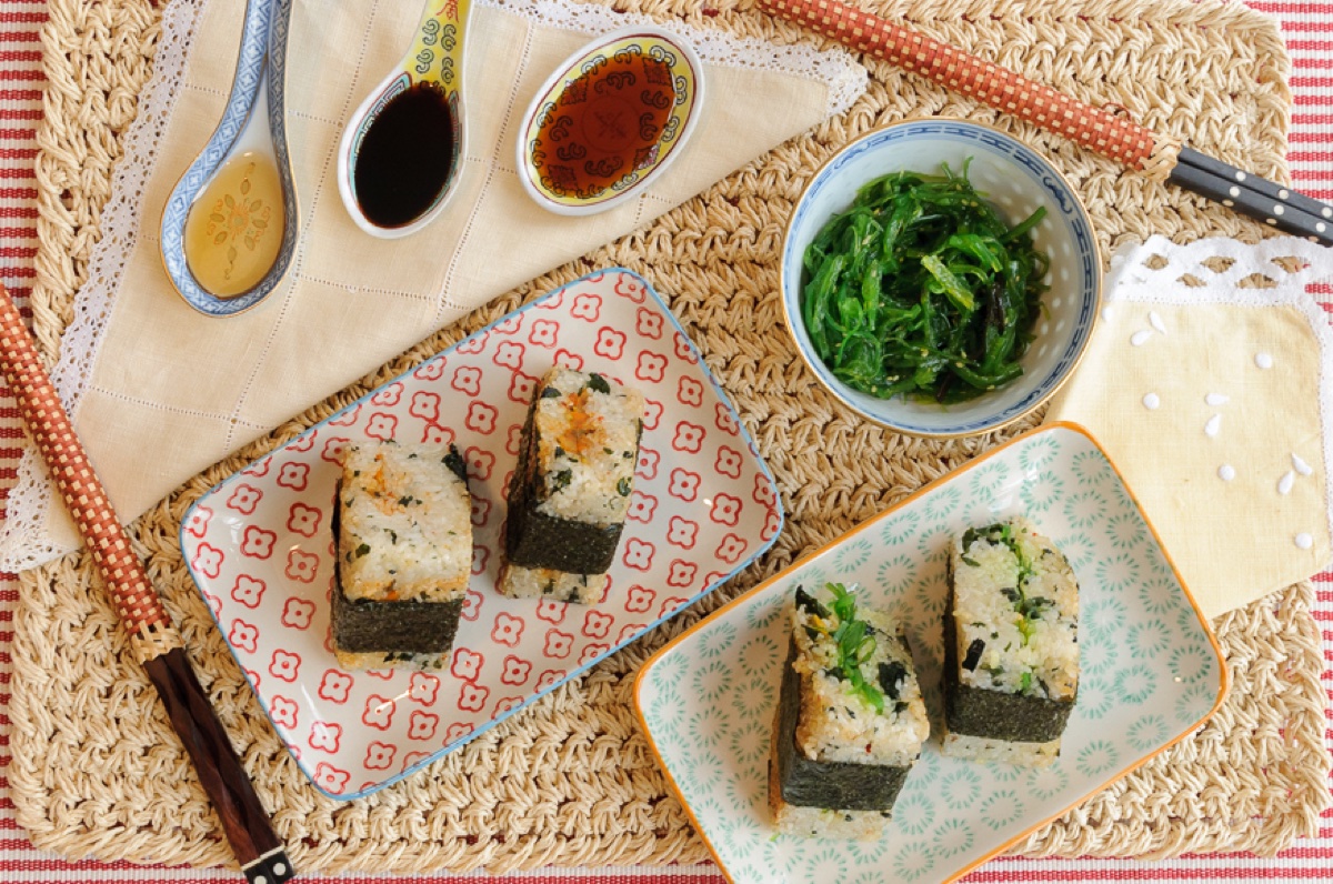 Cuando todos los triangulitos están fritos, colocarlos en la fuente que va a ir a la mesa. Cortar la hoja de alga nori en tiras. Colocar una tira en cada triangulito de lado a lado, marcando el lugar por donde sujetaremos el triangulito con los dedos. Pasar el dedo por encima de ella para que el calor del triangulito haga que se adhiera al arroz.
